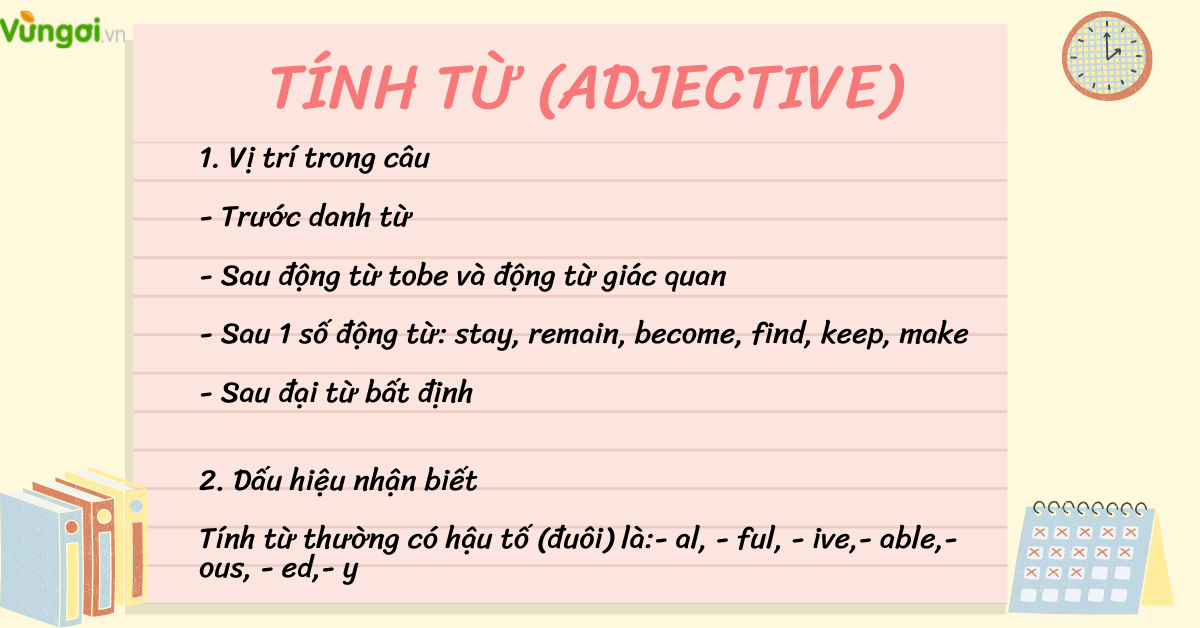 Tính từ là những từ dùng để miêu tả đặc tính, tính cách của sự vật, hiện tượng hay con người. Vai trò của tính từ là bổ nghĩa cho danh từ.
